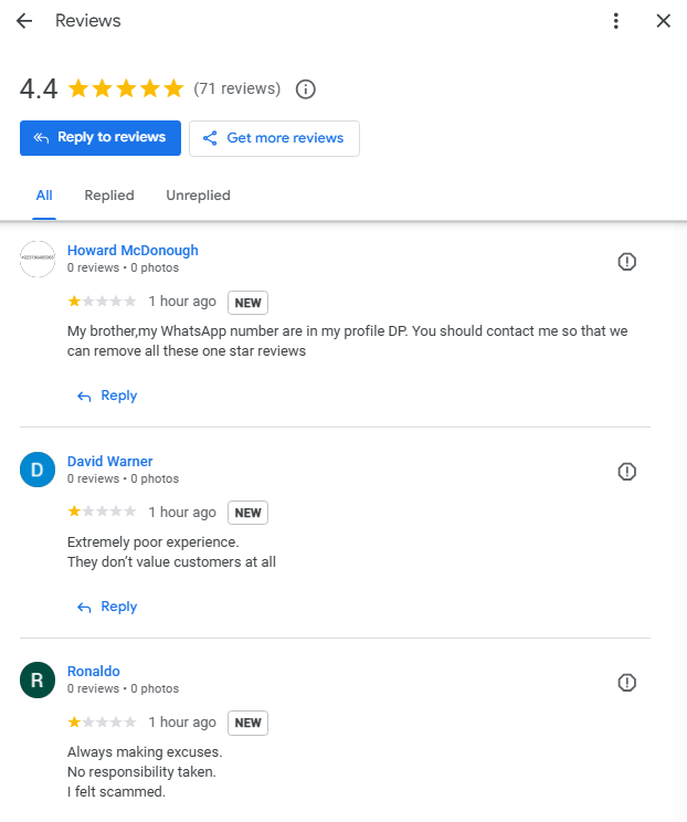 1 - nts asset Αρχικά, εντοπίσαμε τα ψευδή reviews που προέρχονταν από ανενεργούς ή ανώνυμους λογαριασμούς, χωρίς πραγματική εμπειρία με τις υπηρεσίες μας. *Προσοχή δεν υπάρχει κανένας λόγος να απαντήσουμε σε κανέναν scammer λογαριασμό. Καταγράφουμε την ημερομηνία, ώρα, και περιεχόμενο, ώστε να διαθέτουμε αποδεικτικά στοιχεία σε περίπτωση αναφοράς.